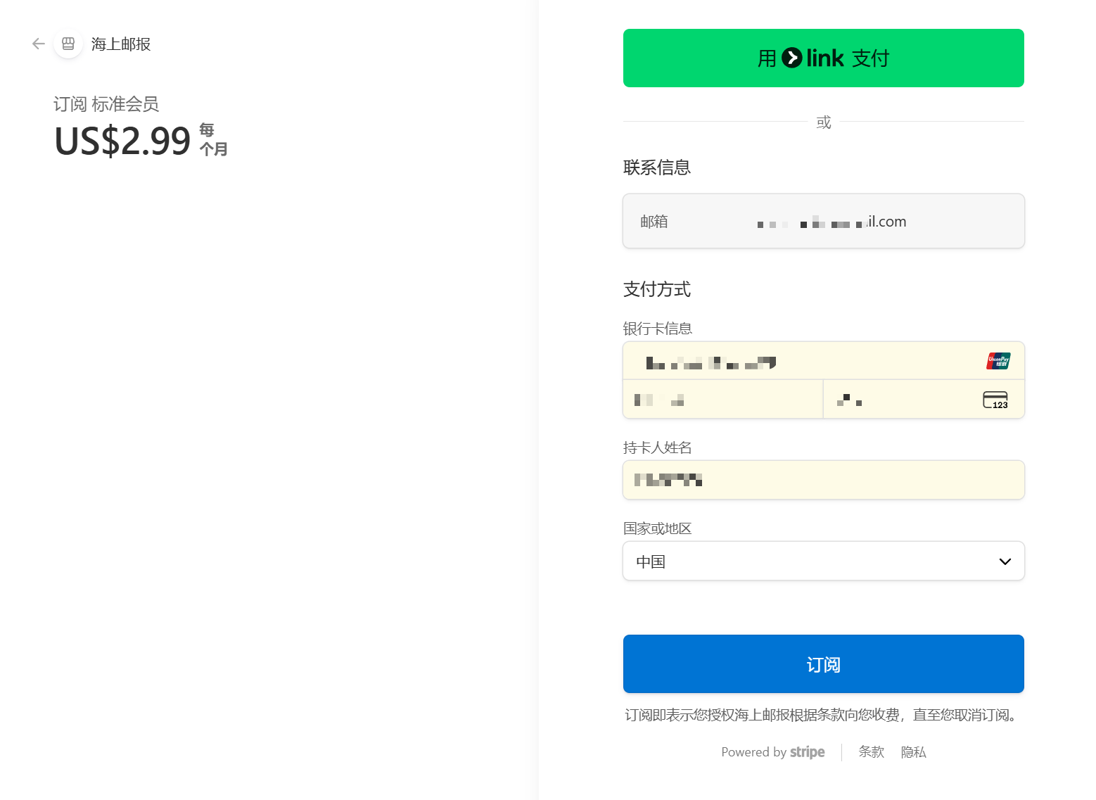 三,完成支付:系统将跳转至 Stripe 原生支付页面。Stripe 支持带有银联标志的中国信用卡(须支持外币消费),也支持 Visa, MasterCard 等国际信用卡。因为政策原因,我们暂时不能支持国内的微信、支付宝等人民币支付方式。
