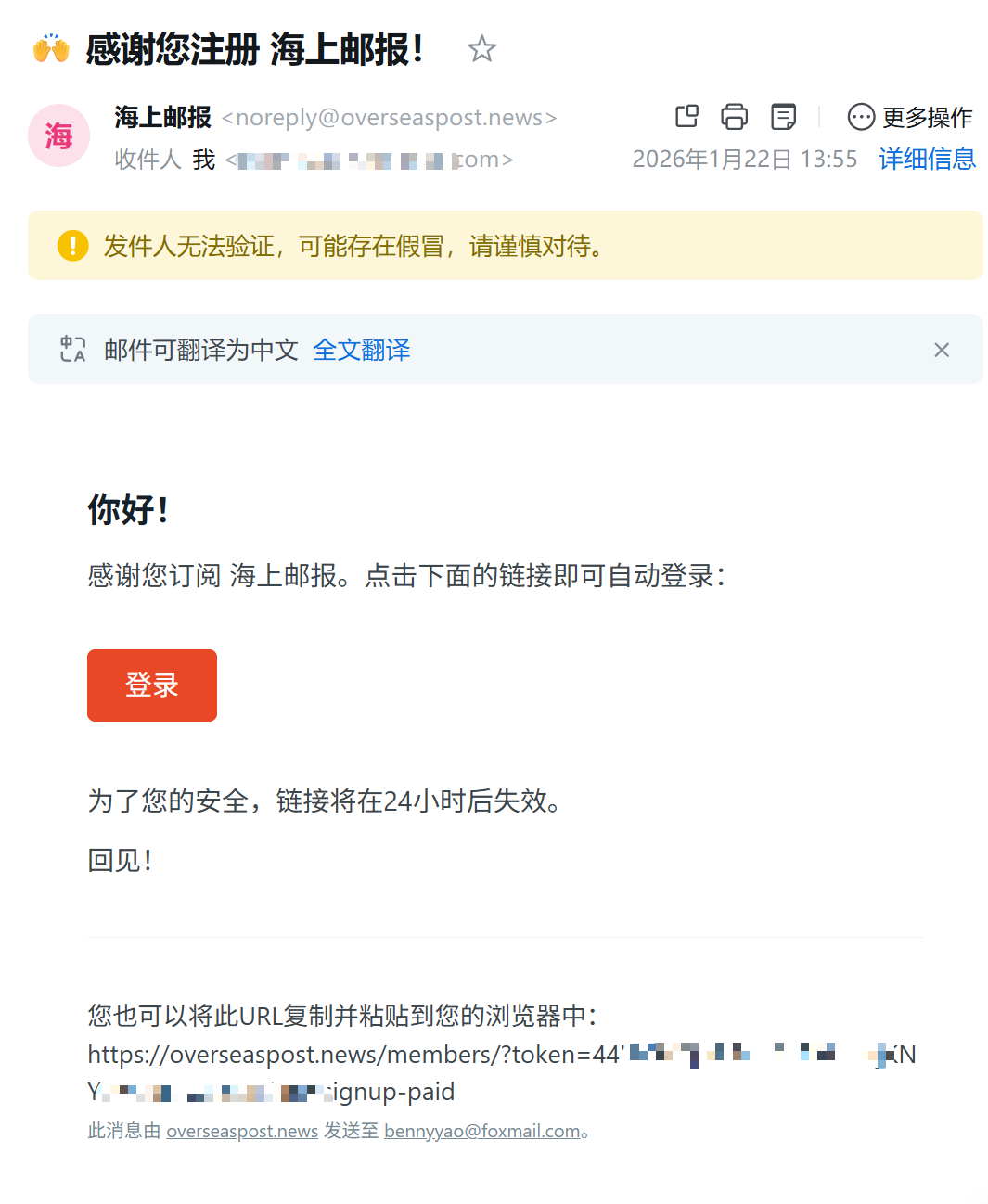 请检查你的垃圾邮件箱 (Spam)。建议将 hi@overseaspost.news 加入邮件白名单,以确保能正常接收魔术链接和文章推送。 - 如何管理我的订阅?